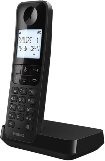טלפון אלחוטי Philips D2701B/25 בעיצוב שחור אלגנטי עם תצוגת מסך מוארת, איכות שמע גבוהה וקלות שימוש. פתרון מושלם לבית או למשרד.